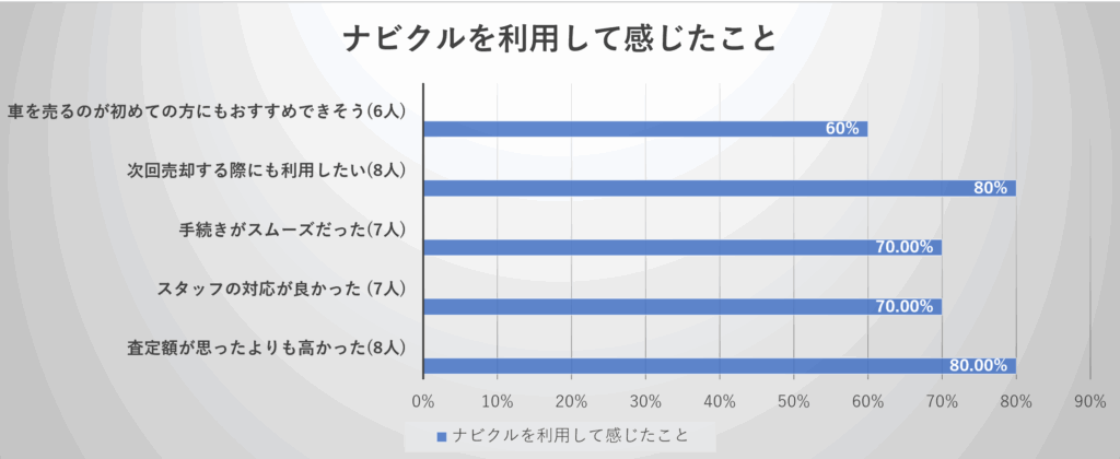 - 「ディーラーよりも査定額が高い」「スピーディーだった」という声が目立っていた。