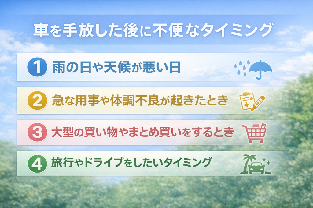 ここでは、車を手放した後に不便に感じるタイミングを詳しく説明します。