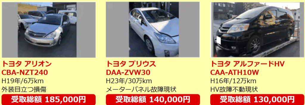 - 事故車・過走行車・低年式車でも0円以上の値段が付く。