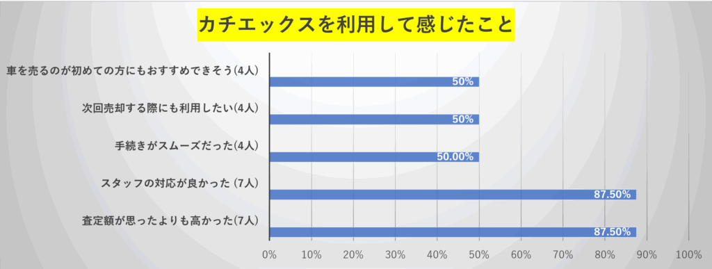 - コメント・・・「一括査定を使うのは初めてでしたがカチエックスは全体的に使いやすい印象でした。申し込み後の流れが分かりやすくスタッフも丁寧で安心して任せられました。」