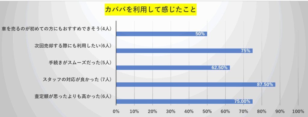 - コメント・・・「初めての車売却で不安もありましたが、カババは全体的に利用しやすく、丁寧に対応してもらえたため安心して進められました。」