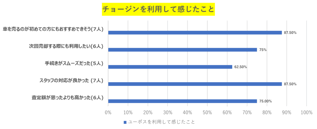 アンケートでは8人中7人が「車を売るのが初めての方にもおすすめできそう」「スタッフの対応が良かった」という感想を寄せています。