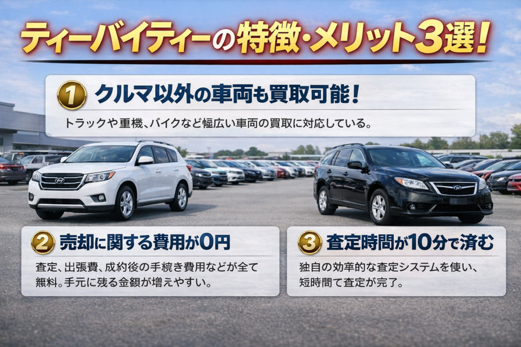 「愛車を1円でも高く売りたい」という方は、一度ティーバイティーの公式サイトをチェックしてみましょう。