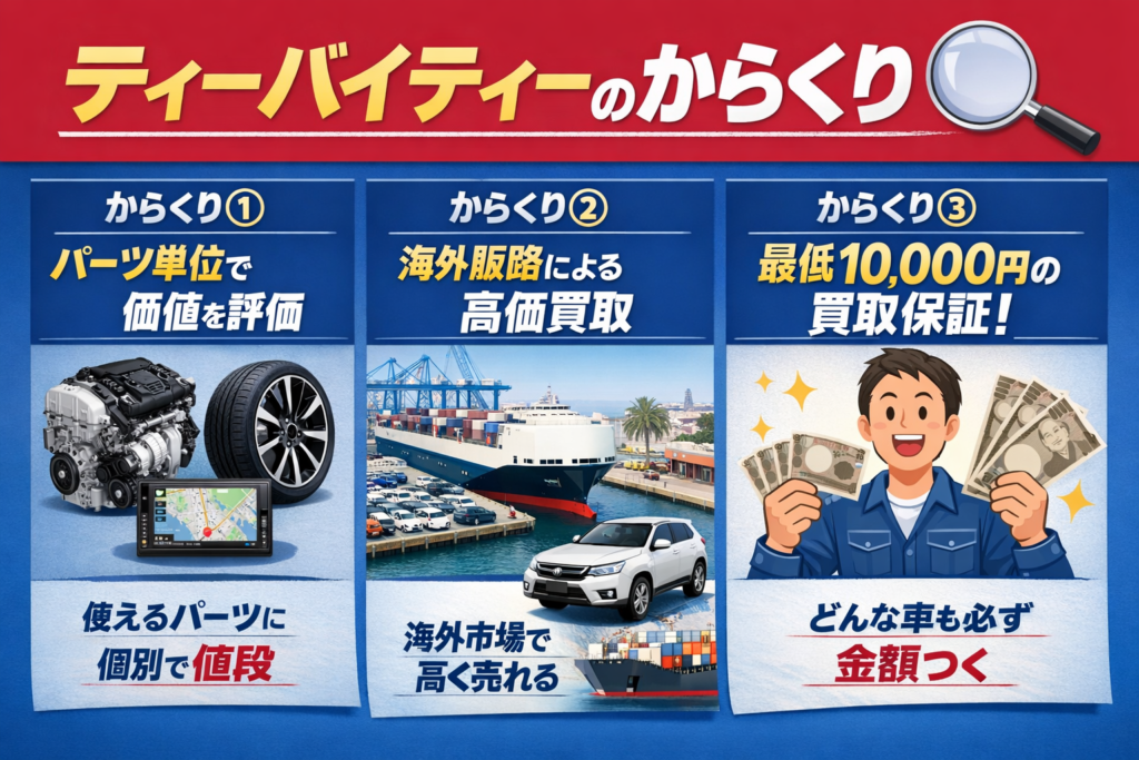 ティーバイティーでは「最低10,000円の買取保証」が用意されており、どんな状態の車でも安心して売却できます。