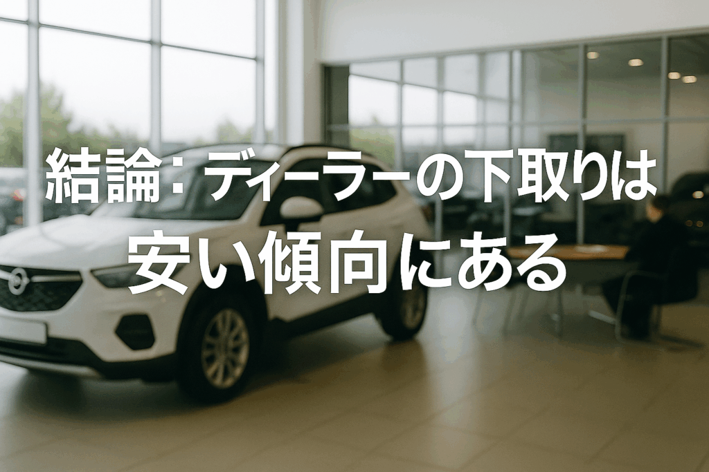 結論:一概には言えないが、ディーラーの下取り価格は買取専門店よりも低い傾向にある。