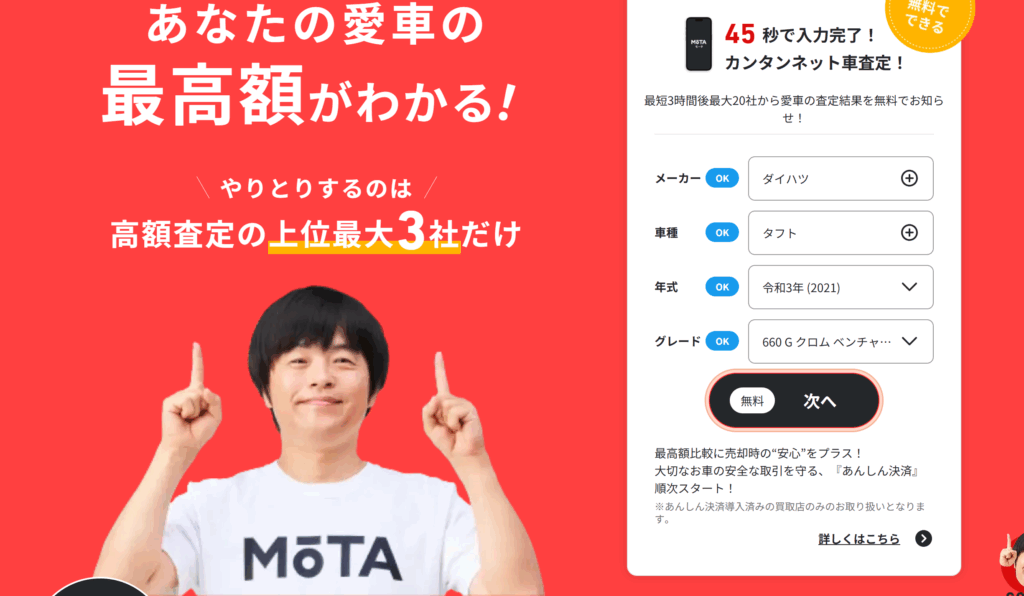 ちなみに、「愛車を1円でも高く売りたい」という方は一括査定サイトを提供しているMOTAがおすすめです。