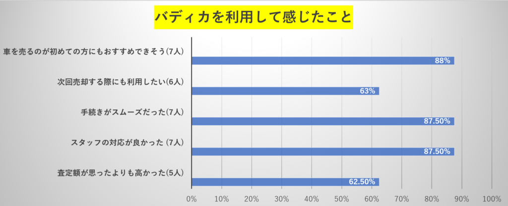 - コメント・・・「総合的に見て、安心して利用できる車買取サービスだと感じました。」