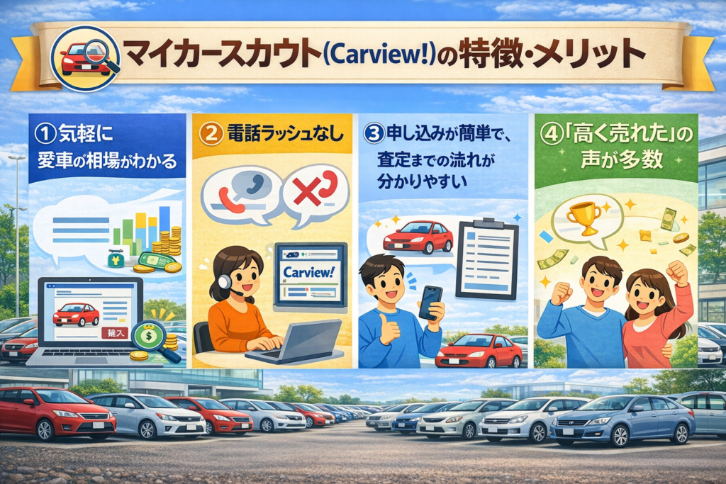 今回はマイカースカウト(Carview!)の口コミをはじめ、特徴やデメリットについても詳しく解説しています。